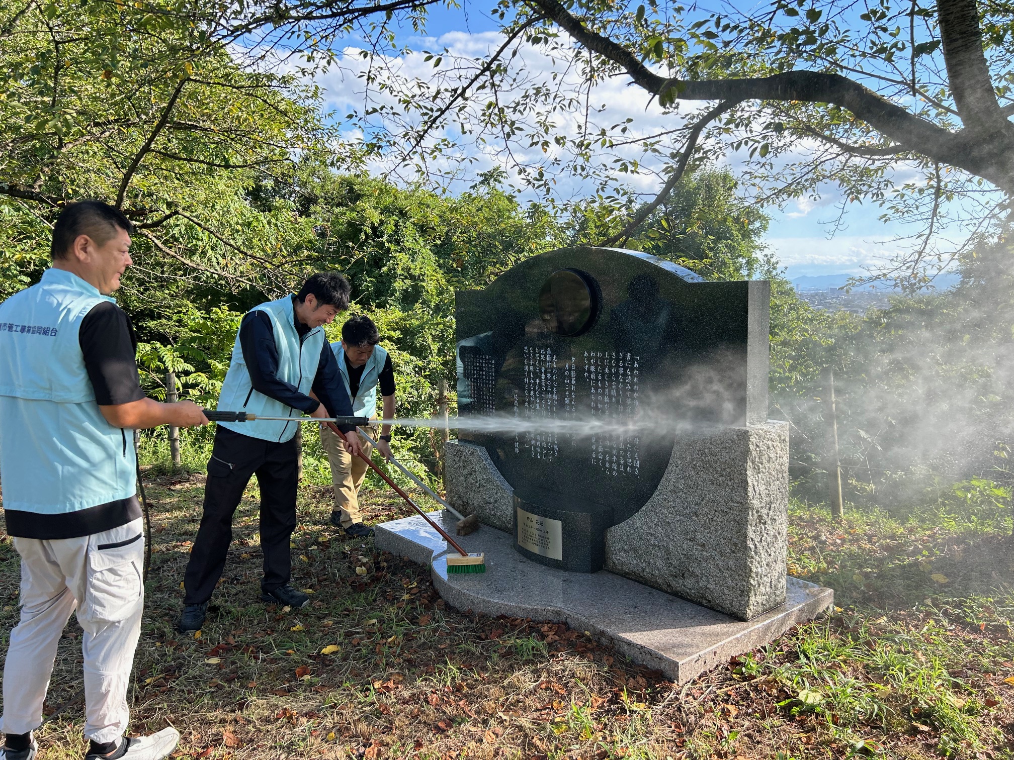 今年度は組合員16名、取引業者様7名の計23名が参加し、昨年までと同様に舞鶴山に点在するモニュメントや案内看板・石碑、また愛宕沼親水空間の遊歩道沿いにある手すりなどの水洗い清掃を行いました。